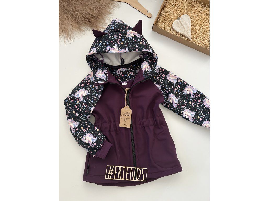 Dětská softshellová bunda, rostoucí, fialová, vzor jednorožec, ouška, jaro, léto, podzim,