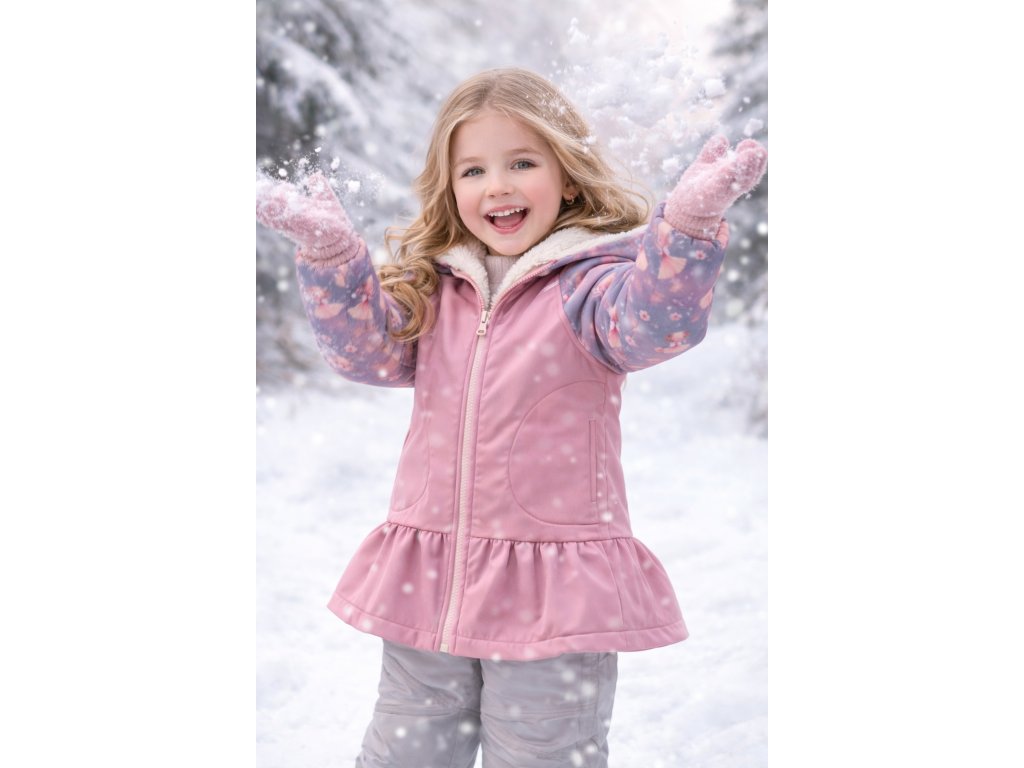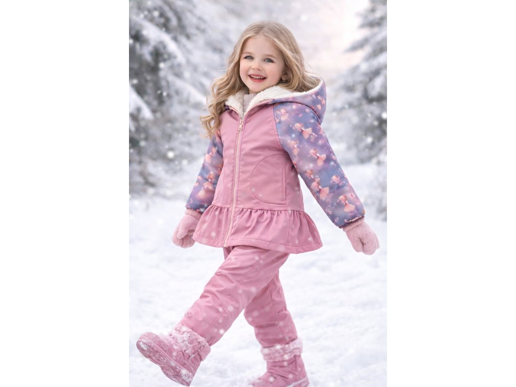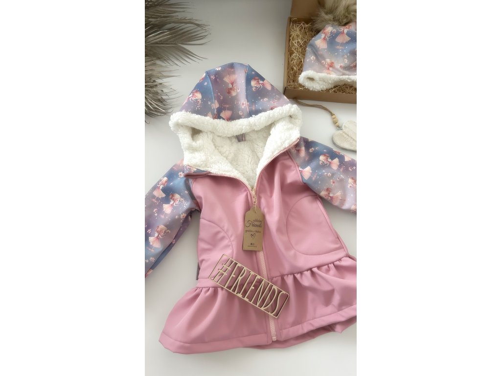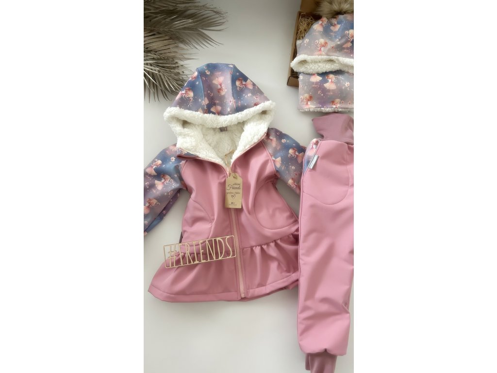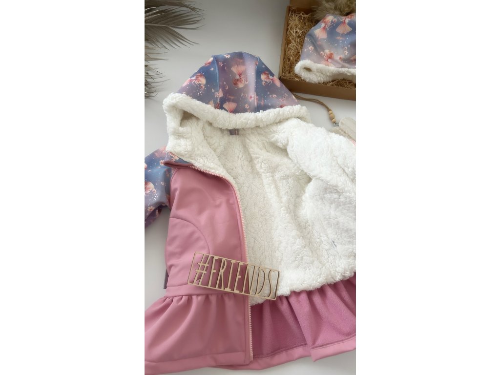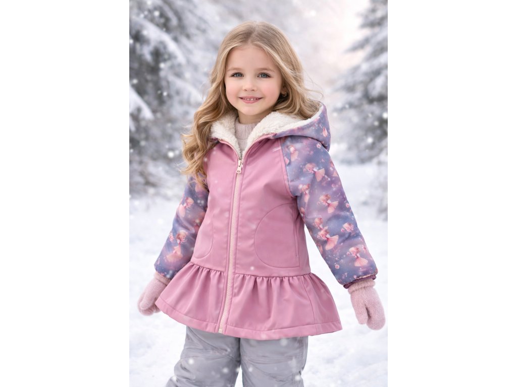 Dětská softshellová bunda s beránkem, zimní s volánkem , starorůžová, vzor víla