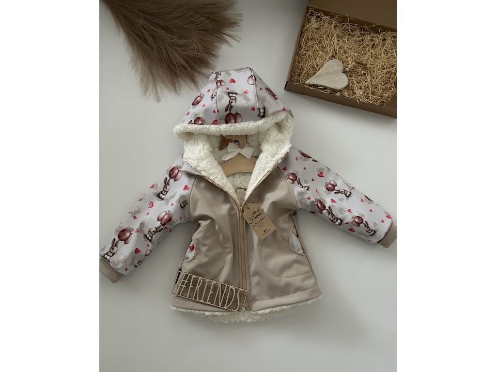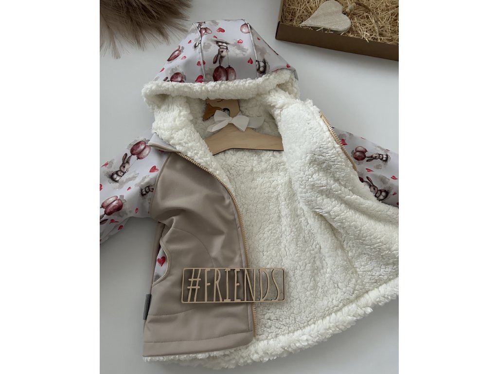 Dětská softshellová bunda zimní s beránkem, béžová/ vzor zajíček, holka