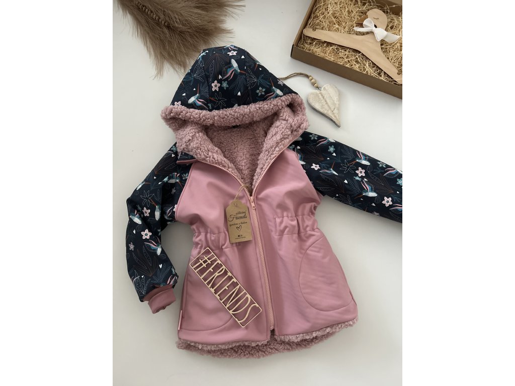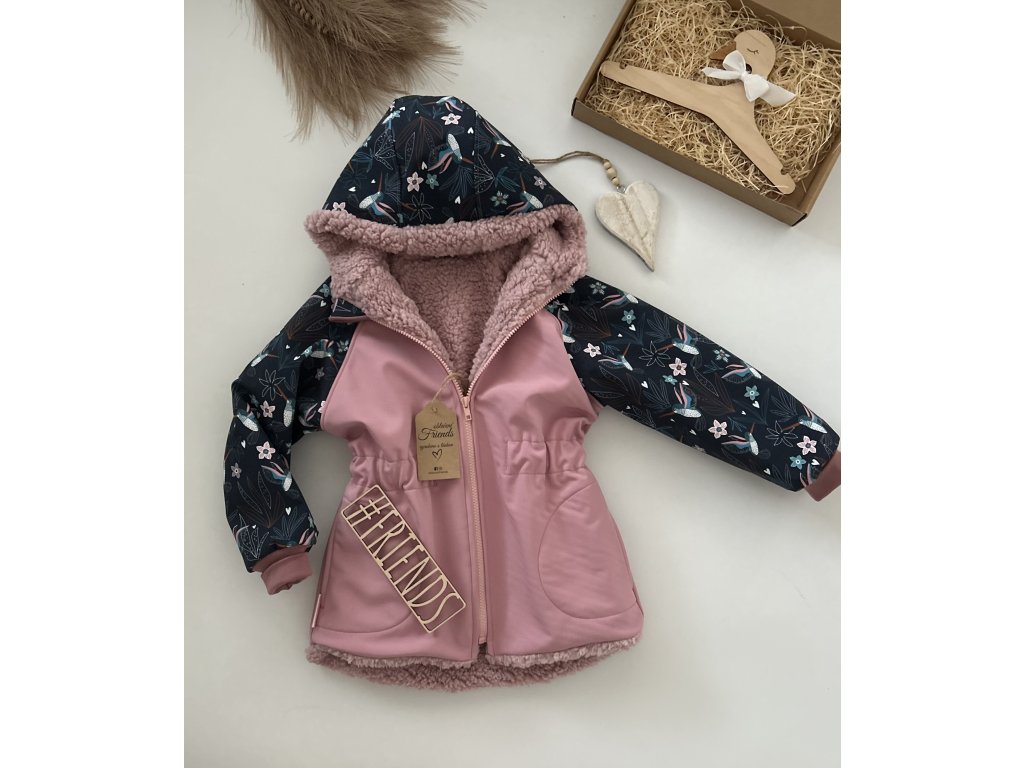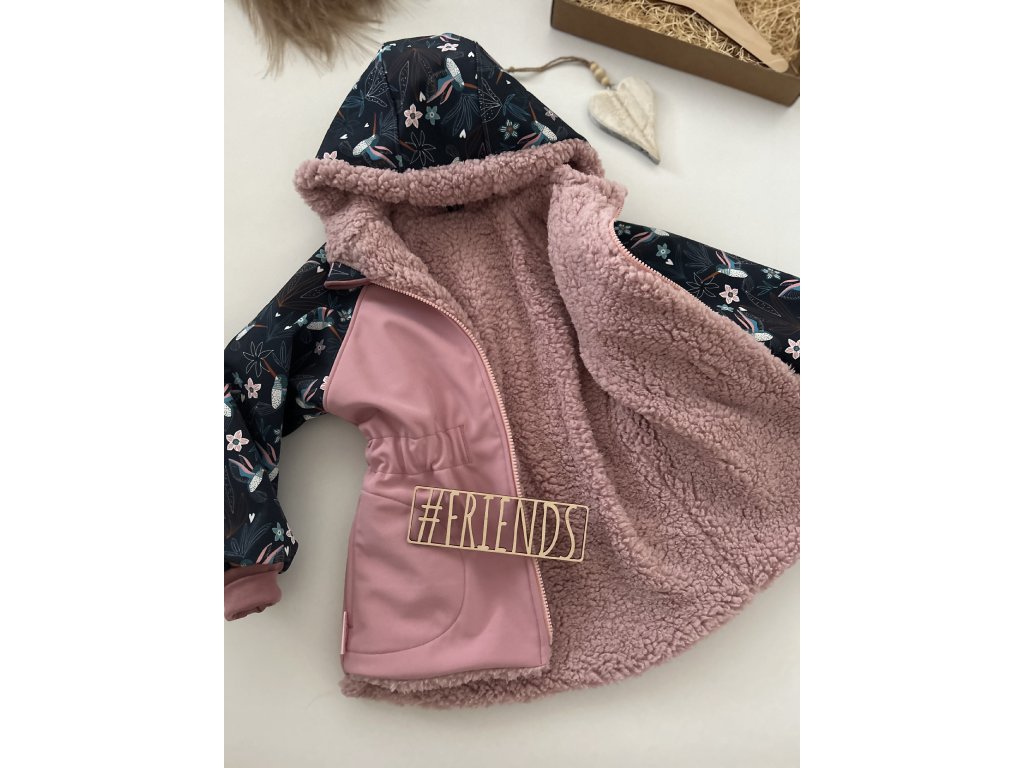 Dětská softshellová bunda s beránkem, zimní, starorůžová, vzor ptáci, holka
