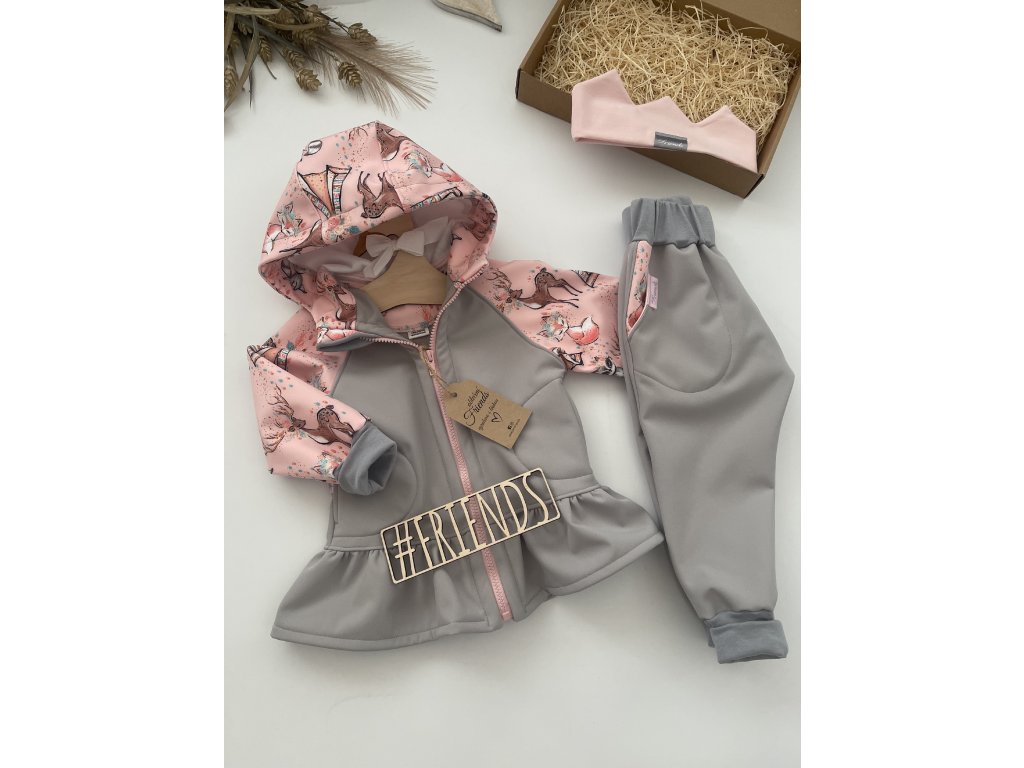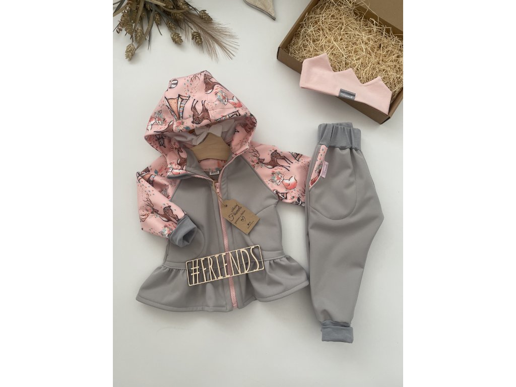 Praktická dětská softshellová souprava bunda s volánkem + kalhoty s rostoucími náplety a jemným chloupkem z rubu. Skvěle padne, vydrží déle a ochrání děti v každém počasí.