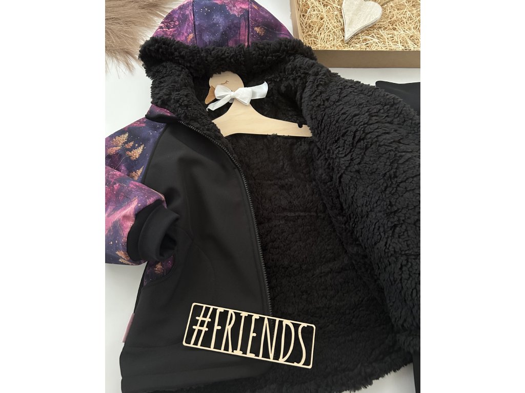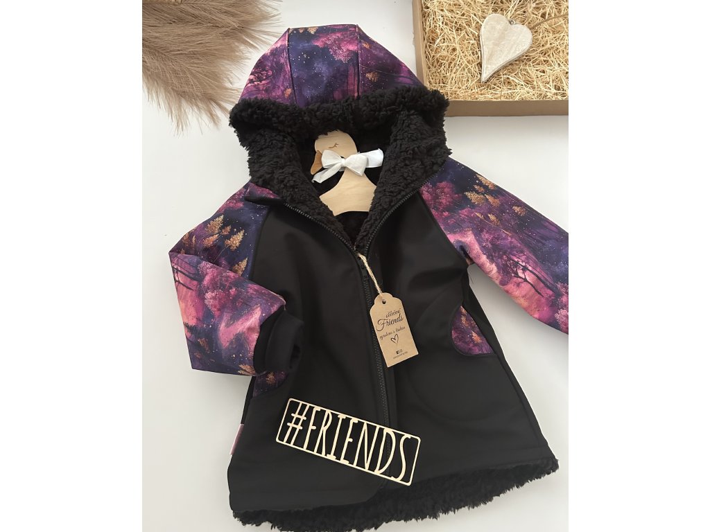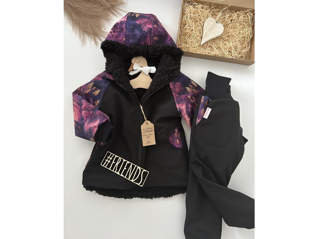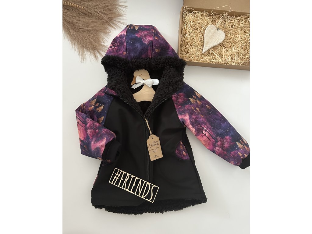 Dětská softshellová bunda s beránkem zimní, černá vzor barevný les - holka